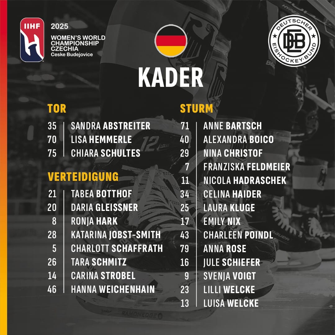 Frauen-Bundestrainer Jeff MacLeod hat ein 25-köpfiges Aufgebot der Frauen-Nationalmannschaft für die IIHF-Weltmeisterschaft vom 9. bis 20. April 2025 in Budweis (CZE) bekanntgegeben. Dabei setzt MacLeod weitestgehend auf ein eingespieltes Team aus drei Torhüterinnen, acht Verteidigerinnen und 14 Stürmerinnen, dass erfolgreich die Qualifikation für die Olympischen Spiele 2026 in Mailand und Cortina erreicht hat. Auch beim Coaching- und Team-Staff rund um die Mannschaft setzt der DEB auf bewährte Kräfte. Die Frauen-WM wird live bei Magentasport übertragen.
